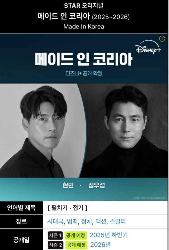 2025년 하반기, 디즈니+가 야심차게 선보일 오리지널 드라마 〈메이드 인 코리아〉는 1970년대 대한민국이라는 뜨거운 시대를 배경으로 한 정치 스릴러다.